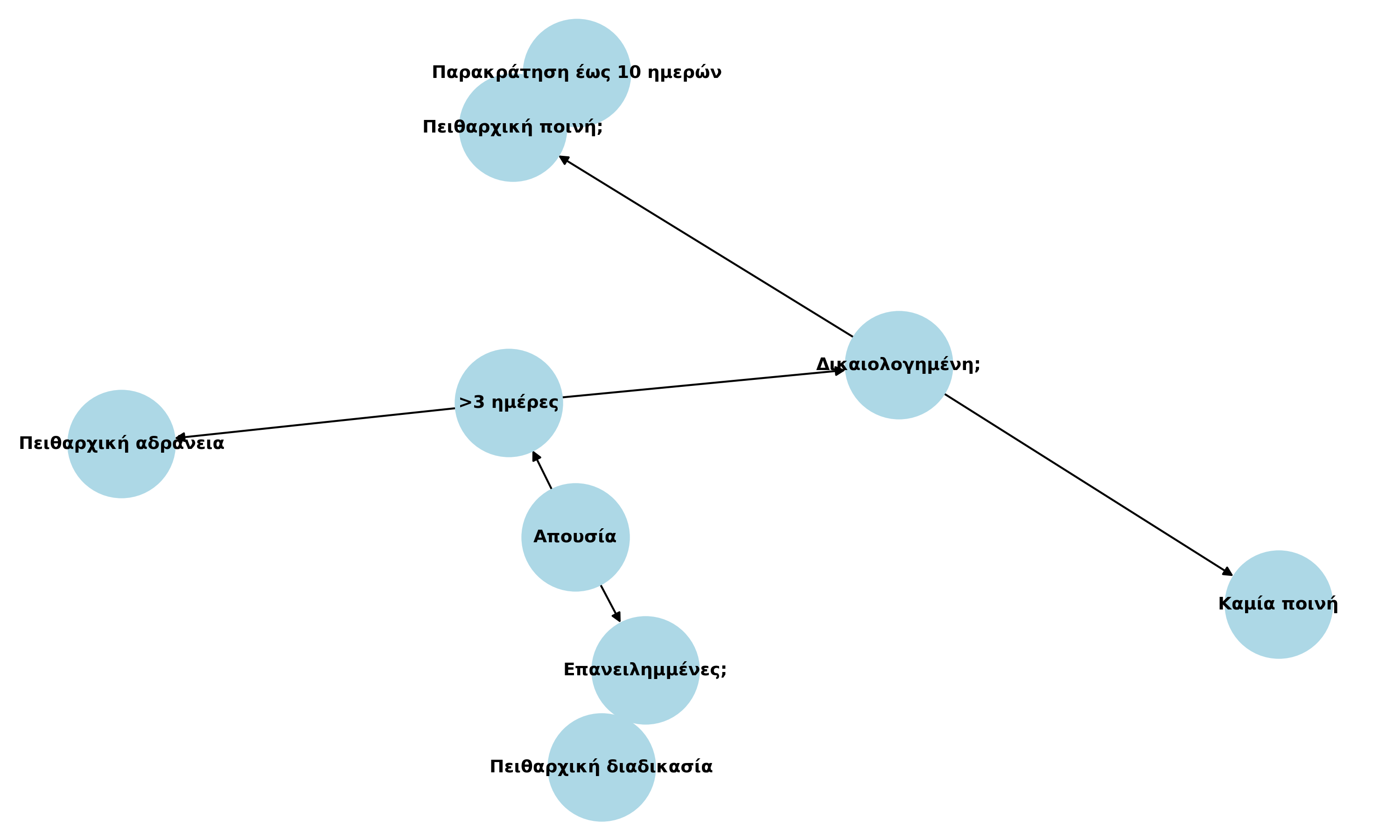 «Αν ο εργαζόμενος απουσιάσει αδικαιολόγητα για χρονικό διάστημα άνω των τριών (3) ημερών, δύναται να του επιβληθεί πειθαρχική ποινή προστίμου, συνιστάμενη σε παρακράτηση αποδοχών έως δέκα (10) ημερών. Αν η απουσία κριθεί δικαιολογημένη, δεν επιβάλλεται ποινή. Σε περίπτωση επανειλημμένων απουσιών, κινείται υποχρεωτικά η προβλεπόμενη πειθαρχική διαδικασία».
