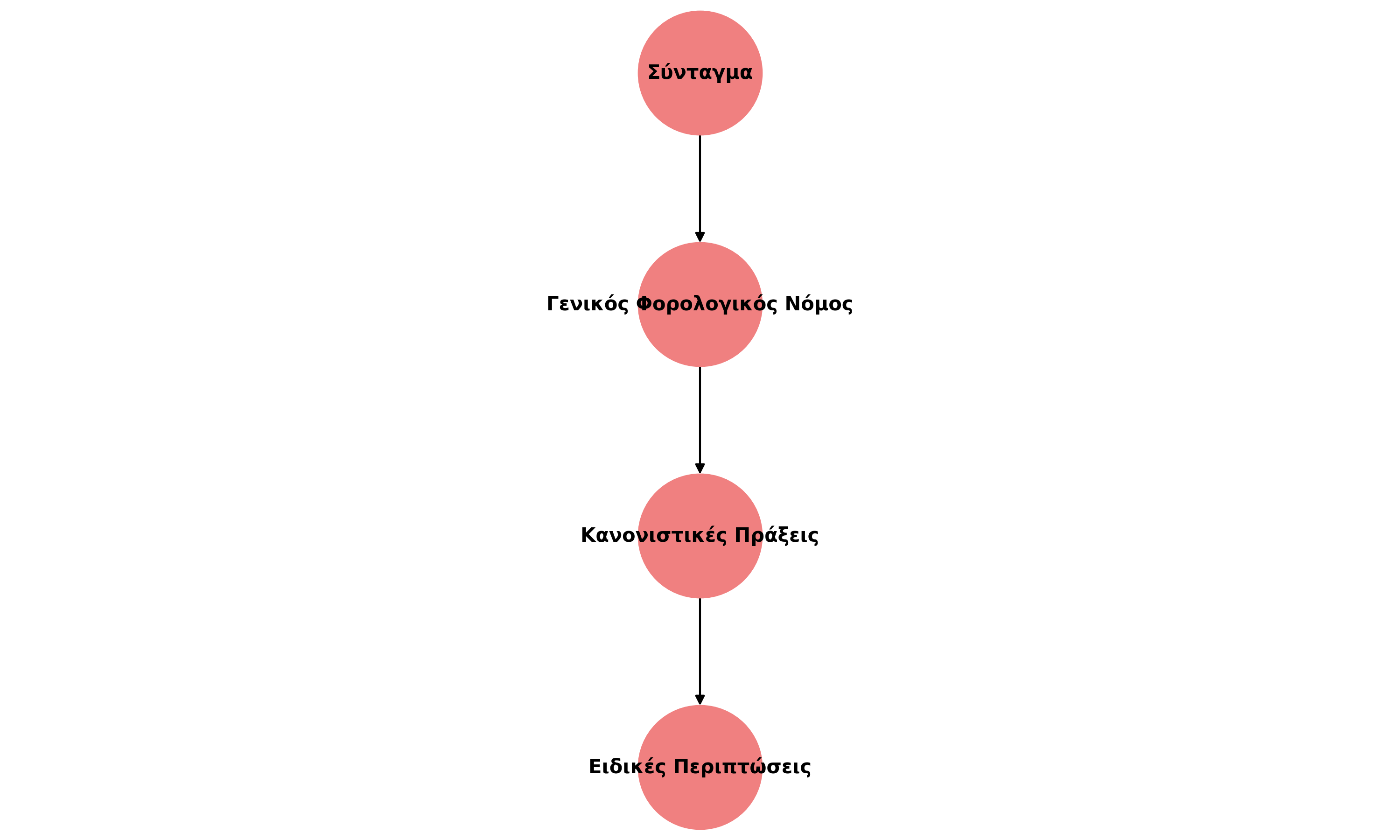 Ένας φορολογικός νόμος μπορεί να βασίζεται σε μια γενική συνταγματική αρχή ισότητας στα δημόσια βάρη (ρίζα), να ερμηνεύεται μέσω ενός γενικού φορολογικού νόμου (πρώτο επίπεδο) και να εξειδικεύεται με κανονιστικές πράξεις για ειδικές κατηγορίες φορολογουμένων (δεύτερο ή τρίτο επίπεδο). Όσο αυξάνεται το βάθος και το πλάτος του δέντρου, τόσο πιο σύνθετη γίνεται η ερμηνεία και εφαρμογή του κανόνα δικαίου.